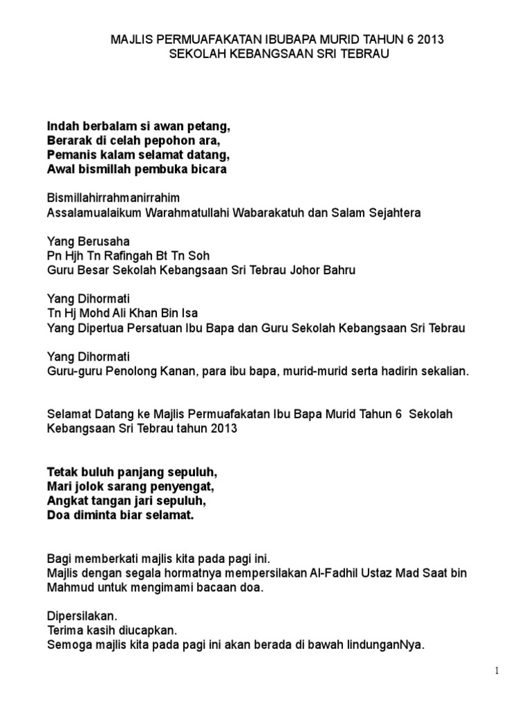 830 am Ucapan Pengerusi Majlis. Teks pengacaraan program permuafakatan ibu bapa guru dan murid sk sungai sengian 1 2019 28 jun 2019 bil agenda teks 1 ucapan alu aluan pengerusi majlis sirih berlipat sirih pinang sirih dari pulau mutiara pemanis kata selamat datang awal bismillah pembuka bicara. Penganjuran Majlis Permuafakatan Ibu Bapa dan Guru-Guru Tahun 6 2011 ini adalah berdasarkan keperihatinan pihak sekolah dan PIBG terhadap kepentingan membentuk persefahaman di antara pihak sekolah dan ibu bapa bagi memastikan kecemerlangan murid-murid tahun 6 dalam Ujian Pencapaian Sekolah Rendah pada tahun 2011.