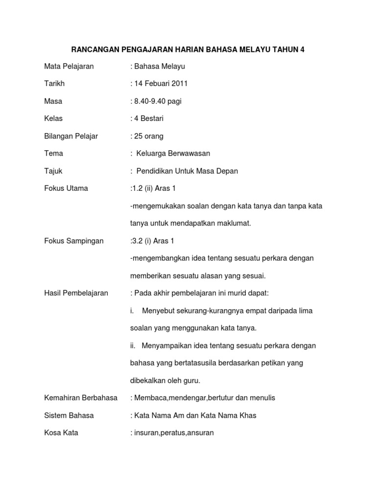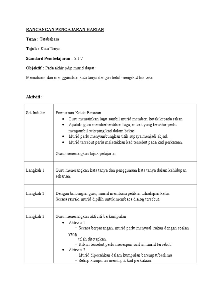 Membaca petikan bertajuk Keluarga Lina dengan sebutan dan intonasi yang betul. Ayat Tanya dengan kata Tanya ialah ayat yang mengandungi kata Tanya seperti berapa bila bagaimana mengapa dan kenapa. Contoh RPH Tahun 2.